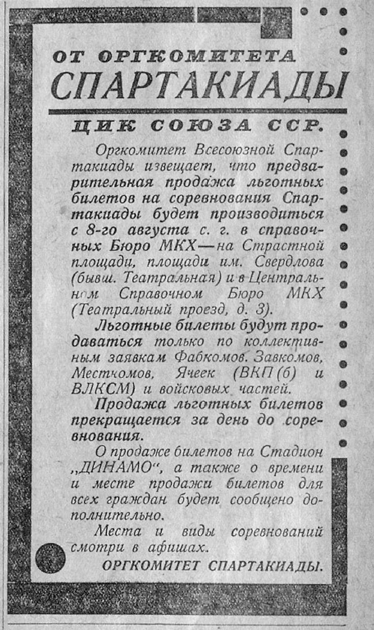 Объявление Оргкомитета Спартакиады о предварительной продаже льготных билетов («Известия ЦИК СССР и ВЦИК» от 8 августа 1928 года)