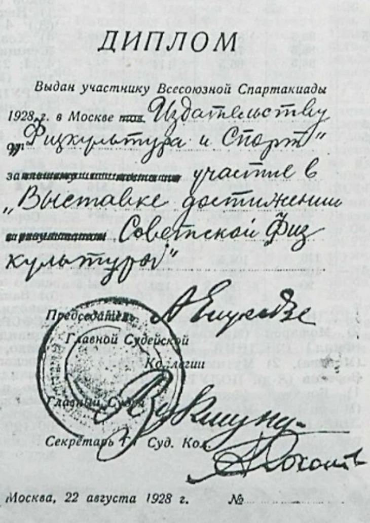 Диплом («художественная грамота»), которыми награждались победители I Летней Спартакиады (bidspirit.com)