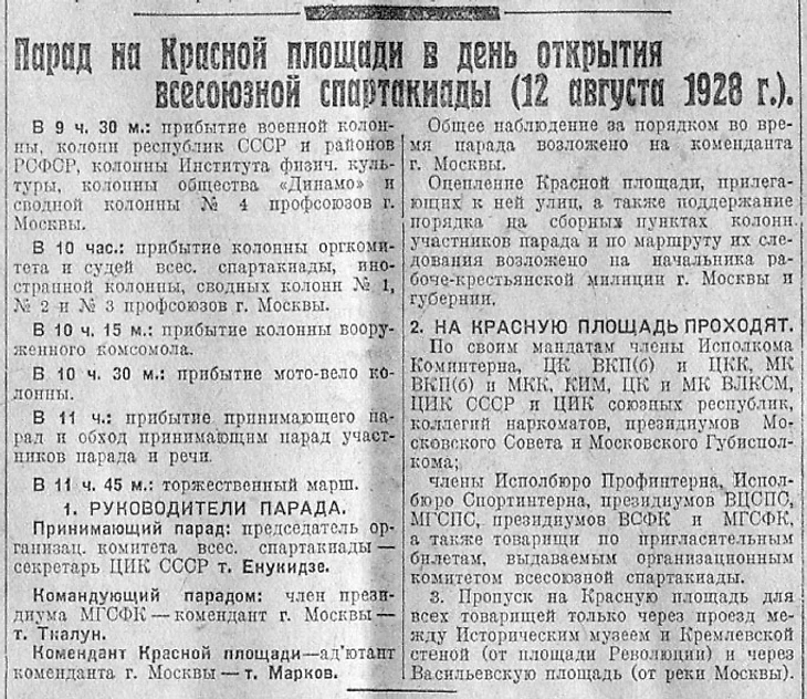 Расписание парада на Красной площади 12 августа 1928 года (газета «Известия ЦИК СССР и ВЦИК» от 5 августа 1928 года)