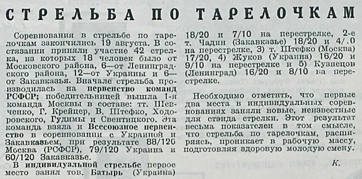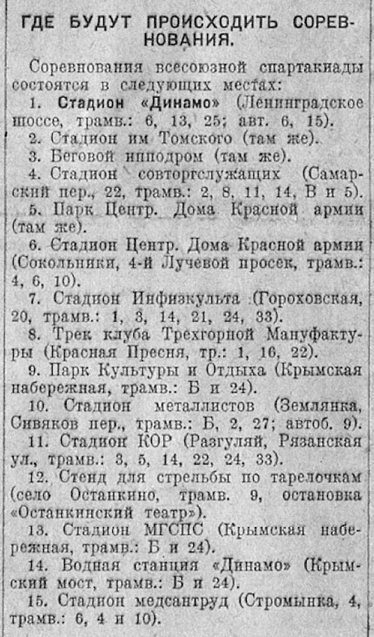 «Ни одно советское теннисное соревнование из бывших до сих пор, не может сравниться по своему блеску с теннисным турниром на Всесоюзной Спартакиаде. Достаточно лишь перечислить, что Австрия, Финляндия, БССР, ЗСФСР, УССР, Туркменистан, Узбекистан, район автономных республик, Северный, Волжский, Центрально-Промышленный, Центрально-Земледельческий районы послали на Спартакиаду свои лучшие теннисные силы. Таким образом, советский теннис оказался представленным во всей своей полноте. Если же принять во внимание, что наиболее сильные в теннисном отношении города - Ленинград и Москва - выставили буквально все свои без исключения лучшие силы, то станет очевидным, что наш теннис был представлен не только во всей полноте, но и в полном блеске. Подведенные к настоящему моменту итоги дают возможность привести несколько «ошеломляющих» цифр. Так, например, командные соревнования сложились из 286 индивидуальных матчей, а личные первенства СССР составили 307 матчей, т.е., иначе говоря, теннисный турнир на Спартакиаде представлял из себя розыгрыш 593 встреч. Число небывалое и рекордное. <...> Во время Спартакиады центральной теннисной базой явились площадки ЦДКА на Екатерининской площади.