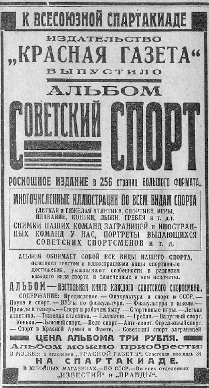 К Спартакиаде было подготовлено иллюстрированное издание «Советский спорт» (реклама из газеты «Известия ЦИК СССР и ВЦИК»)