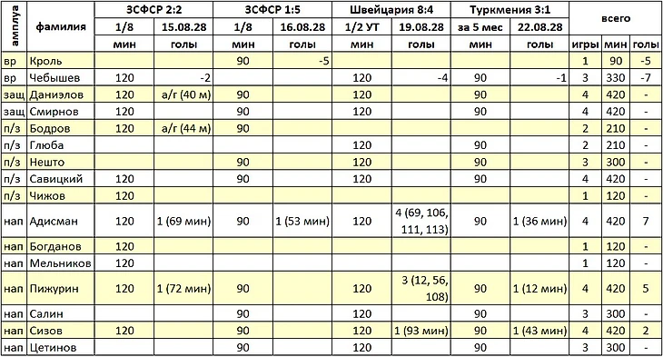 У: Кроль - Смирнов, Даниэлов - Бодров, Савицкий, Нешто - Адисман (к), Пижурин, Сизов, Салин, Цетинов