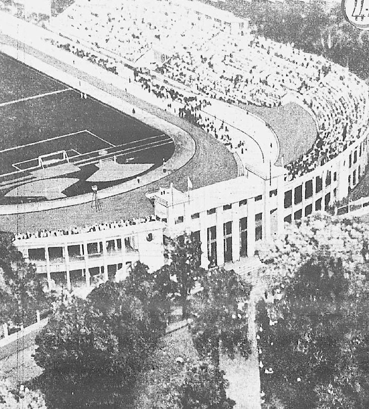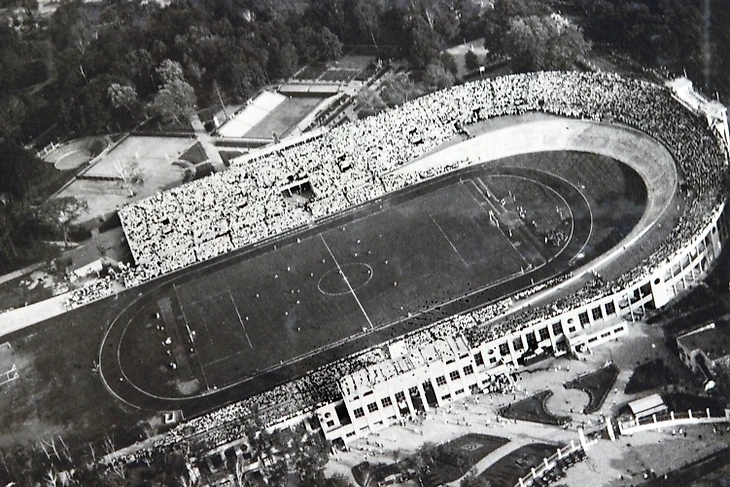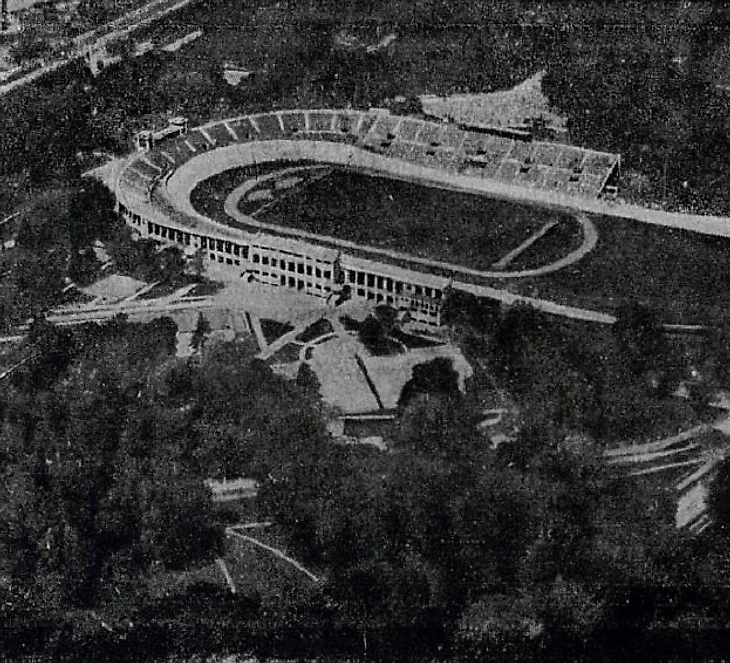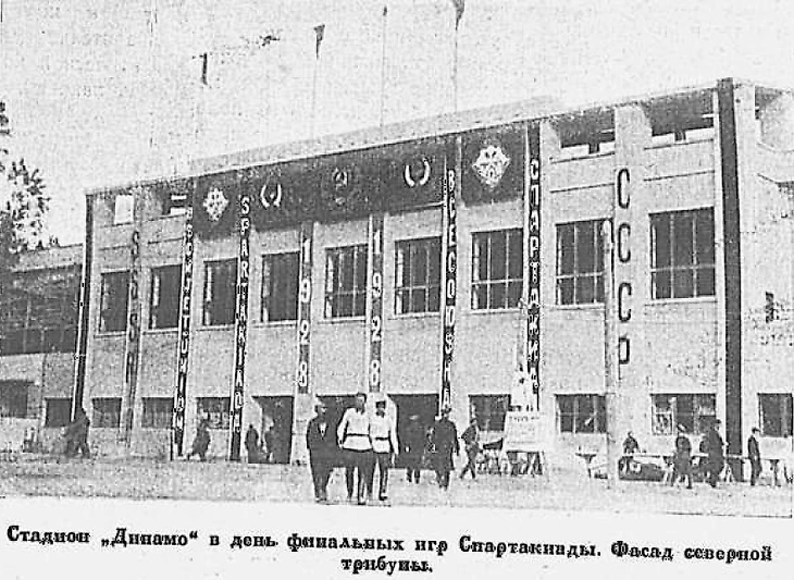1935 год. На этом снимке Макса Пенсона (maxpenson.com и russiainphoto.ru), возможно, запечатлен (если судить по фотографии из «ФиС» матча с участием «Пищевиков») стадион имени Коммунистического интернационала молодежи (стадион им. КИМ). В тридцатые годы в Ташкенте стало еще больше стадионов: имени Акмаля Икрамова, более известный как «Спартак» и ставший главной ареной республики, построенный по проекту архитектора Райхина на базарном пустыре Старого города в 1934 году к I Спартакиаде народов Средней Азии рядом с новым одноименным парком культуры и отдыха в честь первого секретаря ЦК компартии Узбекистана (позже тоже сменившим название), «Динамо» (по вместимости трибун также превосходящий стадион имени КИМ), САВО - Среднеазиатского военного округа