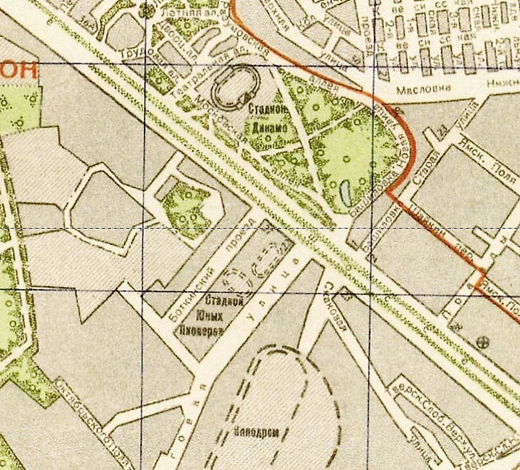 1952 год. План Москвы (фрагмент): место, где располагался стадион ЦДКА. А в верхнем правом углу спортплощадка, получившая, по соседним 2-му Ширяевскому переулку, Большой и Малой Ширяевским улицам, название «Ширяевка», на которой - по данным газеты «Русские ведомости» - в конце XIX века впервые в Москве стали играть в «ножной мяч» без участия иностранцев (летом 1895 года врачи Марковников, Щербачев и Бамштейн организовали здесь площадку для детских игр в рамках деятельности Комиссии по устройству подвижных игр на открытом воздухе при Московском гигиеническом обществе; футбольное поле пригодное для официальных матчей появилось здесь в 1907 году) / retromap.ru