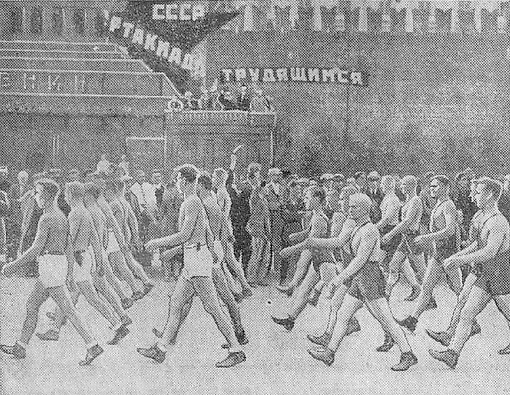 «В параде на Красной площади участвовало свыше 25 тысяч физкультурников Советского Союза, в том числе 600 иностранных рабочих-спортсменов, прибывших на спартакиаду. <…> Казалось, удивить ее [Красную площадь - примечание «ПСФ»] не чем! Но парад физкультурников снова поразил своей красочностью, когда со стороны Исторического музея показались первые колонны голубых маек - физкультурников спортивного общества «Динамо», а навстречу им от Василия Блаженного двинулись оранжевые, красные, зеленые - прибывших на спартакиаду с Поволжья, Сибири, Кавказа. Через 15-20 минут вся площадь отливала бронзой хорошо загорелых молодых здоровых тел, запестрела синими, красными, зелеными, оранжевыми и голубыми майками, и ударил по глазам контраст этого обилия красок с белыми, черными трусами» (газета «Известия ЦИК СССР и ВЦИК» от 14 августа 1928 года).