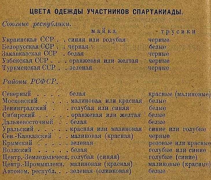 Цвета одежды участников Спартакиады (справочник-путеводитель «Спортивная Москва», составитель М.Б. Чесноков, 1928 год)