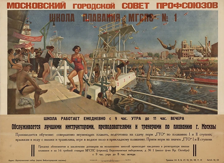 1934 год. Плакат «Школа плавания МГСПС № 1» (из фондов отдела изоизданий РГБ / rsl.ru)