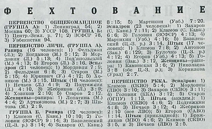 «Всего в соревнованиях приняло участие 110 человек (из них восемь женщин) от 15 районов и республик. <...> По количеству выставленных участников на первом месте Москва - 31. Далее Ленинград -12, УССР и ЗСФСР по 10, Узбекистан и Северный Кавказ по 8, Центр.-Земл. район и Белоруссия по 7, Волжский - 4... <...> Соревнование были разыграно по двум группам А и Б. В первую были отнесены Москва, Ленинград и Украина, во вторую все остальные. <...> В спортивном отношении соревнования дали исключительные результаты. Молодежь в большинстве случаев вплотную приблизилась к мастерам-преподавателям. Из наиболее характерных примеров отметим <...> победу по штыку новичку Егорова (Узб.) с результатом 3:2 над имеющим длительный стаж Климовым (Сев. Кавказ). <...> из молодежи успешно выступили <...> Егоров (Узб.)» (журнал «Физкультура и спорт» № 38 за 1928 год).