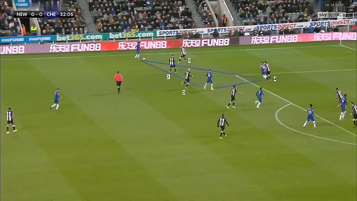 В этом эпизоде треугольник Аспиликуэта-Маунт-Виллиан стянул на себя сразу четырех игроков «Ньюкасла». В результате Канте получил больше свободы в полуфланге. После навеса он скинет на Абрахама, тот пробьет в каркас, но арбитр свистнет офсайд.