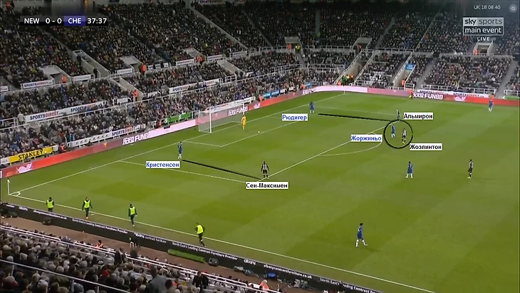 У Альмирона и Сен-Максимена была опциональная нагрузка: они время от времени поднимались прессинговать Рюдигера и Кристенсена. Чаще всего это происходило при ударах «Челси» от ворот. Жоэлинтон в таких ситуациях продолжал концентрироваться на Жоржиньо.