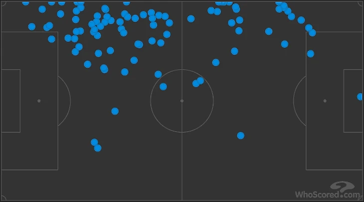Его тепловая карта выглядит специфично: много активности в центре из-за стерильного владения «Челси», вместе с тем – участки активности и выше, и ниже, доказывающие вовлеченность на всех этапах нападения.