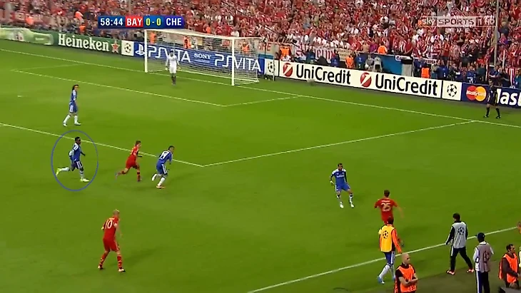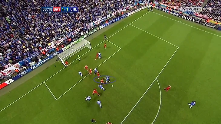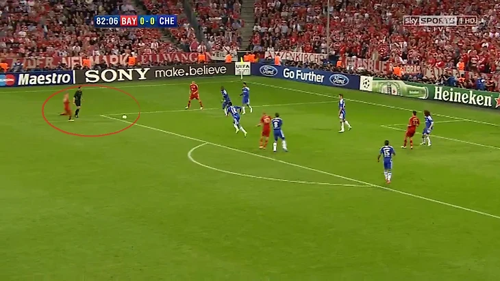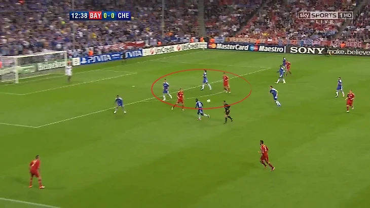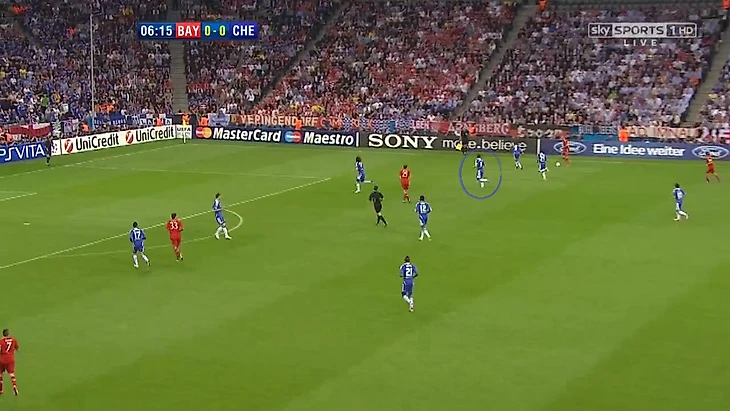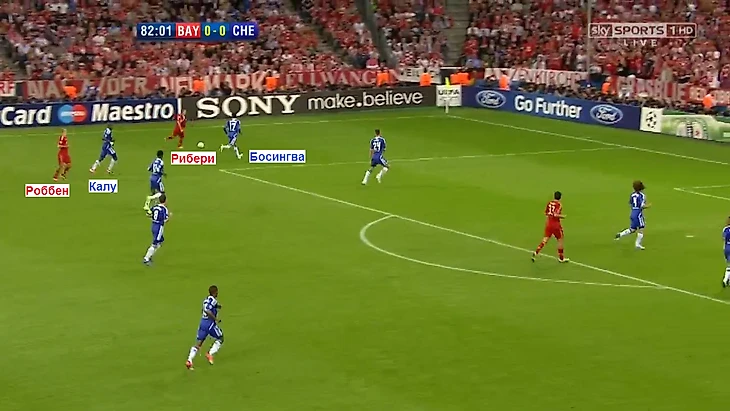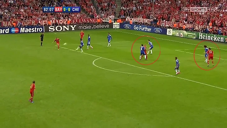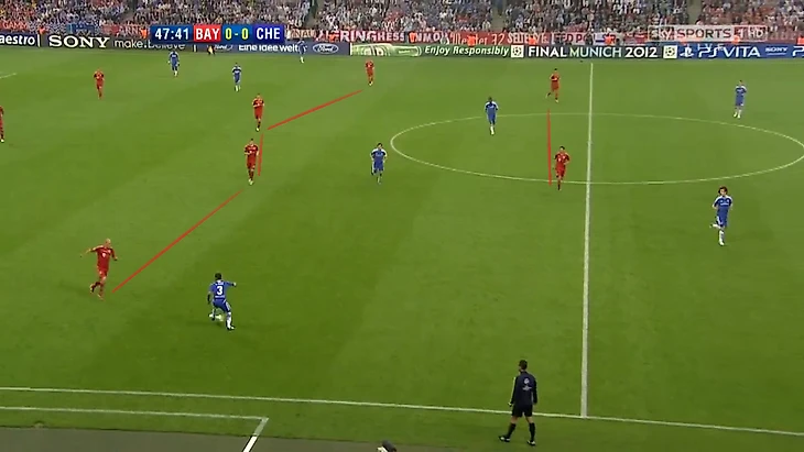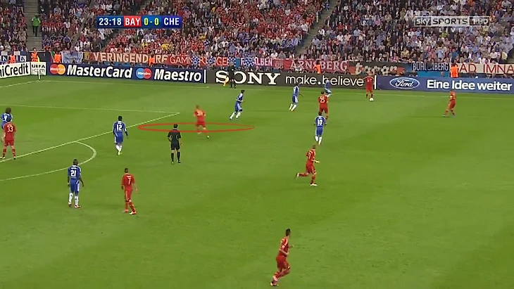 Смещение Мюллера привело к численному преимуществу «Баварии» на фланге. Туда же был вынужден сместиться Микел. В результате опорная зона «Челси» стала свободнее. Позже Роббен нанесет удар именно в результате смещения в эту зону.
