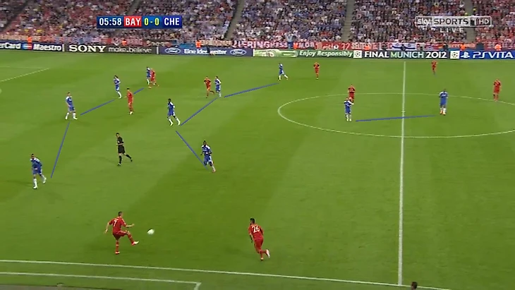 Вдобавок «синие» оказались хорошо готовы к фланговой игре «Баварии», а свободное движение было организовано в первую очередь для Роббена и Рибери. Проблемы «Челси» возникали, когда соперник атаковал широко и задействовал по игроку на каждом горизонтальном участке.
