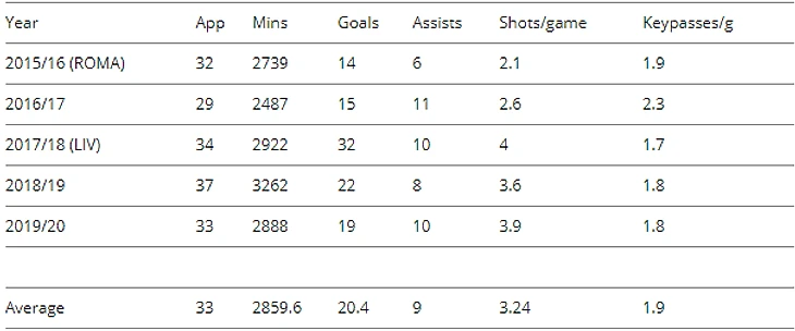 Перед трансфером в «Ливерпуль» Салах набил 20 и 31 результативное действие за «Рому». У Мохамеда было 2,4 удара и 2,1 передачи под удар за игру. Зиеш набрал 24 и 29 результативных действий, а по двум другим цифрам у него 4,8 и 3,9.