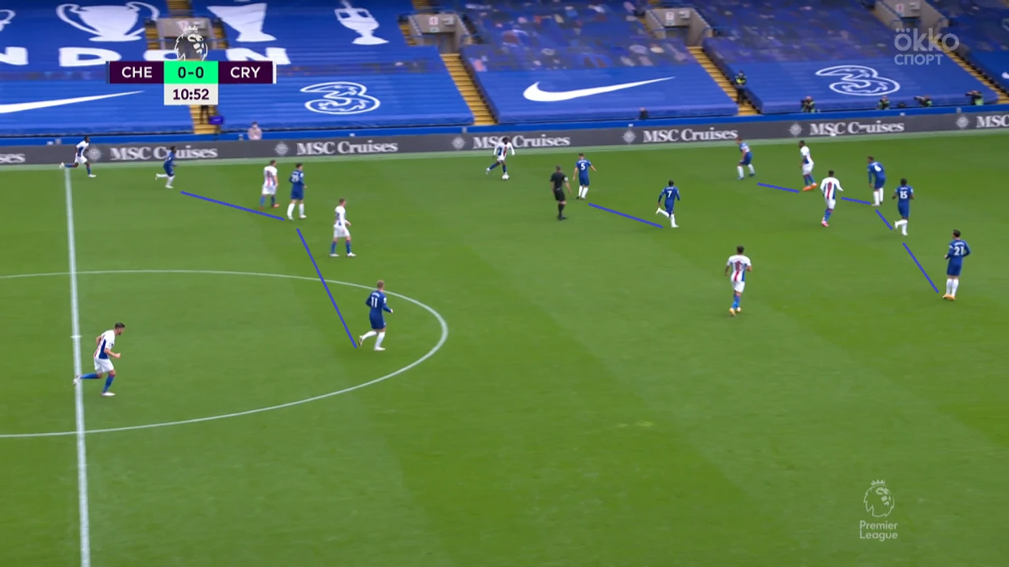 2. Без мяча «Челси» часто включал схему 4-2-3-1. Объяснение тут только одно: Лэмпард хотел создавать ситуации 3-в-2 против Макартура и Маккарти. В целом, это работало. «Пэлас» так же гонял атаки краями.