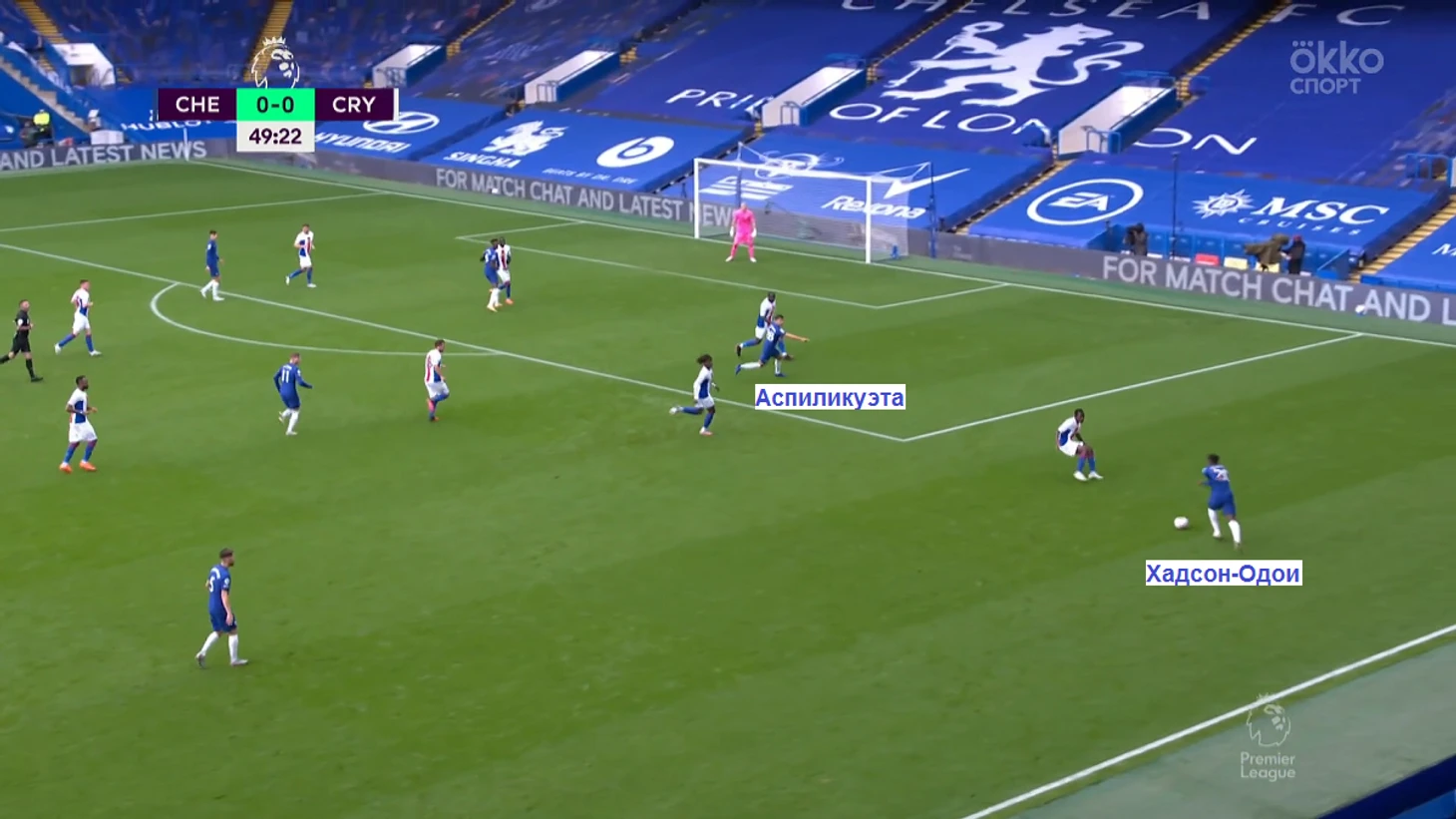 Чаще всего «синие» толкали атаку правым краем, а затем выцеливали диагональ налево. Так вот, в первом тайме Эзе и Митчелл шикарно сдерживали и разбирали Аспиликуэту с Хадсоном-Одои, которые страдали без пространства.
