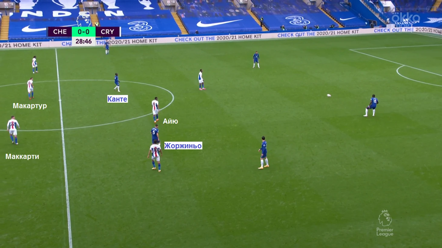 Жоржиньо и Канте старались поправить проблему. Итальянец регулярно сдвигался в первую линию, а француз свободно получал мяч в опорной. Маккарти и Макартур были вынуждены играть глубже и страховать от опусканий Хаверца с Вернером, Айю висел на Жоржиньо, Заа спал – все это создавало для Канте карманы пространства. Но двигать мяч они не помогали.