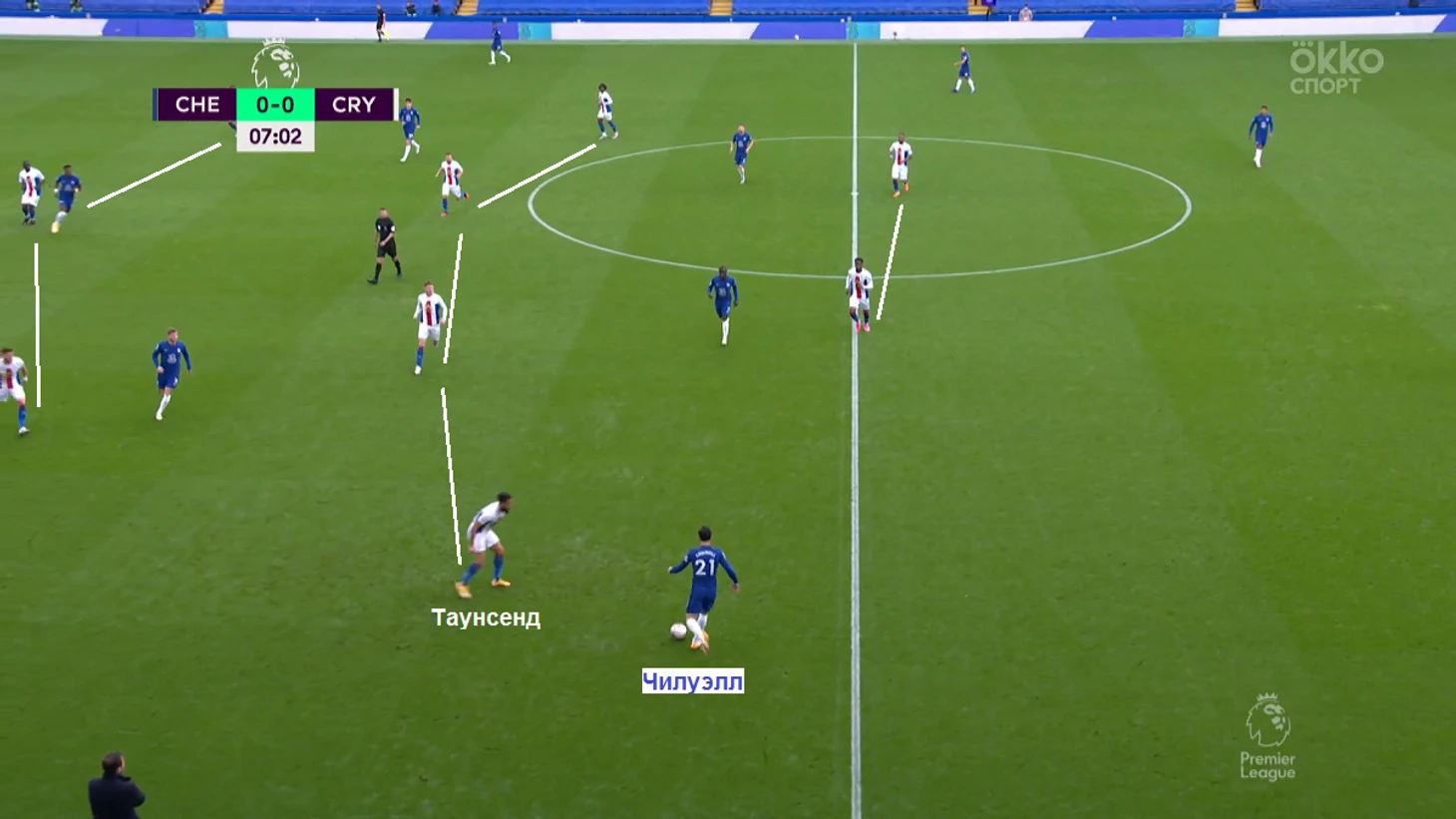 На краях светилась другая проблема: предельно сдержанная и дисциплинированная игра фуллбэков с вингерами. Эзе и Таунсенд успевали прибежать на свою половину, где на пару с Митчеллом и Уордом контролировали двойные фланги «Челси».