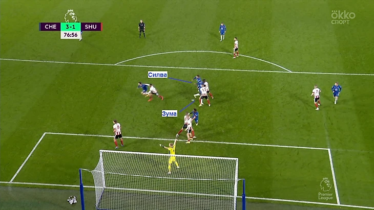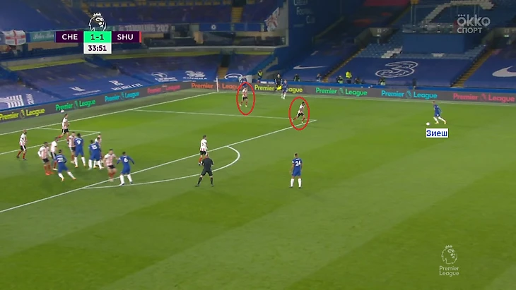 В первом случае задумка оперлась на Зиеша. Маунт и Вернер двинули коротко разыгрывать угловой. Это стянуло внимание «Шеффилда» и позволило Хакиму открыться в низкой позиции, удобной для навеса. Плюс в адресной зоне ошибся Лоу.