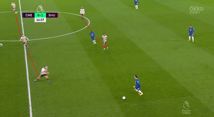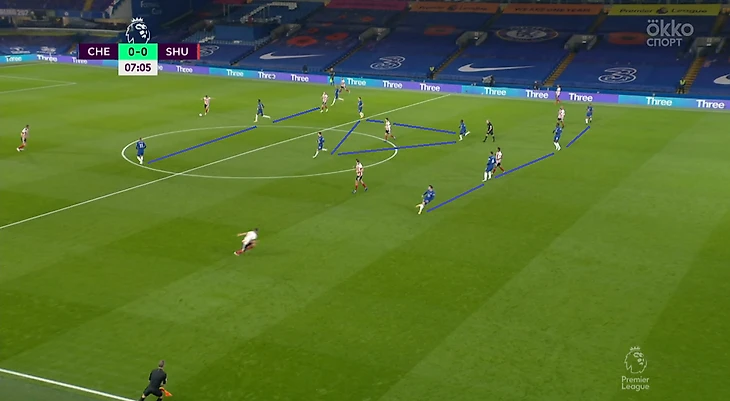 4. «Челси» не отошел от 4-3-3 даже в обороне. Если против «Ренна» и «Бернли» команда перестраивалась на 4-1-4-1, то с «Шеффилдом» придерживалась исходной схемы.