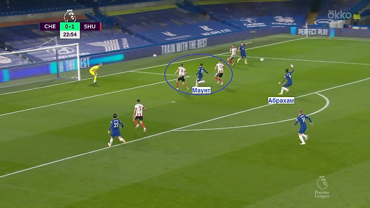 2. В эпизоде с голом Абрахама успешно включился не только Ковачич. Маунт тоже роскошно влетел в штрафную и стянул на себя сразу двух защитников «Шеффилда». Это позволило Тэмми найти одинокую зону для удара.