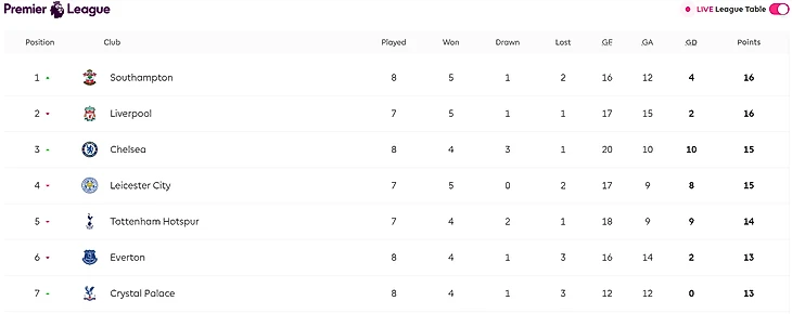 До матчей воскресенья «Челси» взмыл на 3-ю строчку в АПЛ. До грозного «Саутгемптона» и чемпионского «Ливерпуля» – 1 очко. Правда, «красным» еще играть 8-й тур с «Сити». Такая же участь – у «Лестера» с «Тоттенхэмом», которые могут подвинуть «Челси» с теплого бронзового места.