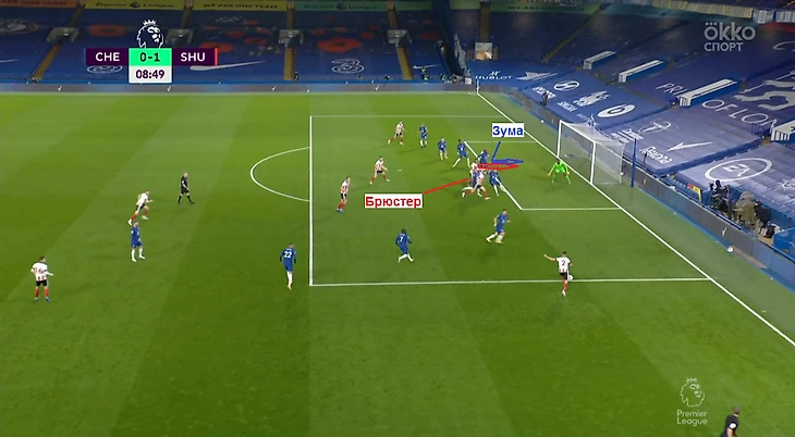 Брюстер путает Зума забеганием и уводит его от Макголдрика. Именно это освободит форварда «Шеффилда» для удара.