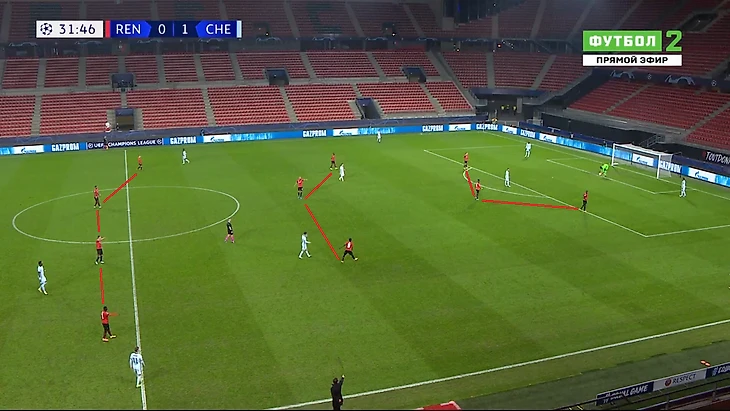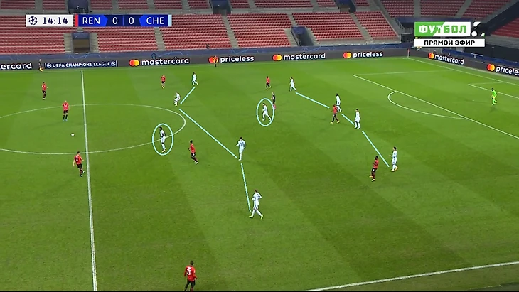 Во втором тайме Лэмпард еще сильнее форсировал прессинг команды. Ковачич стал подниматься к Абрахаму и выше, чтобы давить на центрдефов «Ренна». Это трансформировало схему «Челси» в 4-2-4.