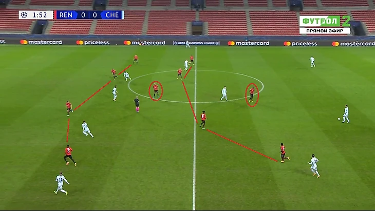 4-3-3 стала ответом на смещения Жоржиньо между центрдефами. Эти движения удалось прикрыть – около половины передач (15 из 32) Менди выкинул на дальнюю дистанцию. Интенсивный прессинг стал еще одним секретом «Ренна» в прошедшем матче.
