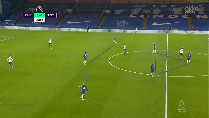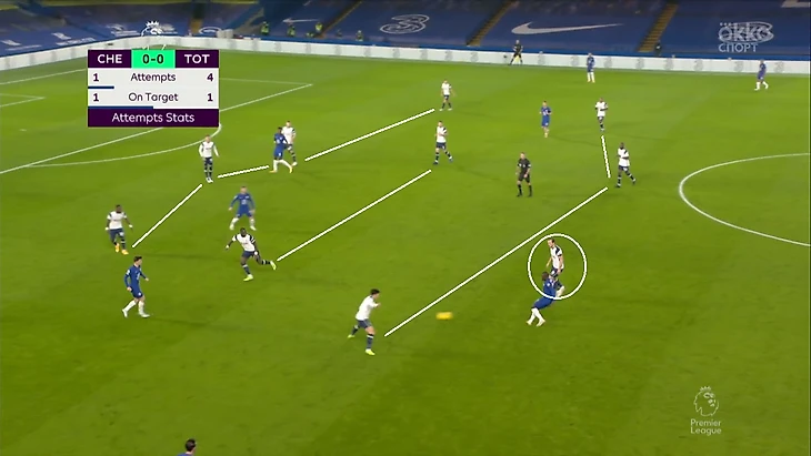 Без мяча «шпоры» выкатили схему 4-2-3-1. В переднем блоке Кейн держался высокой позиции, а Ндомбеле сковывал Канте. Сон и Бергвейн выскакивали на Чилуэлла и Джеймса, если до них добирался мяч. Это должно было тормозить «Челси» уже на запуске владения.