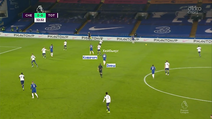«Челси» мог разрушить чужую систему разве что вторым темпом из зоны 14. Предположим, Ковачич и Маунт/Вернер вбежали в полуфланги и вдавили Сиссоко с Хейбьергом – Зиеш получил зону перед штрафной и обострил.