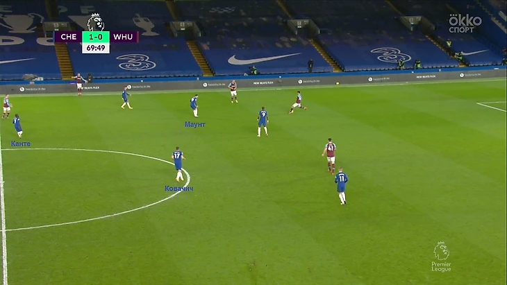 После этой рокировки Канте занял позицию шестерки. Смещение Н’Голо позволило «Челси» прибавить в игре без мяча. Случилось это на ключевом отрезке игры, когда «Вест Хэм» подогревал давление. С начала тайма и до выхода Ковачича «молотобойцы» владели мячом свыше 56% времени и переигрывали соперника по ударам (1-3).