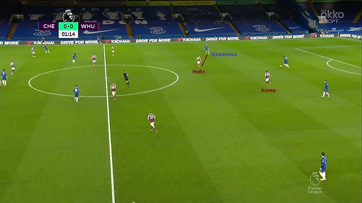 Работа передней линии «Вест Хэма» без мяча. Нобл выдвигается на Жоржиньо (шестерку «Челси»), Аллер остается без привязки.