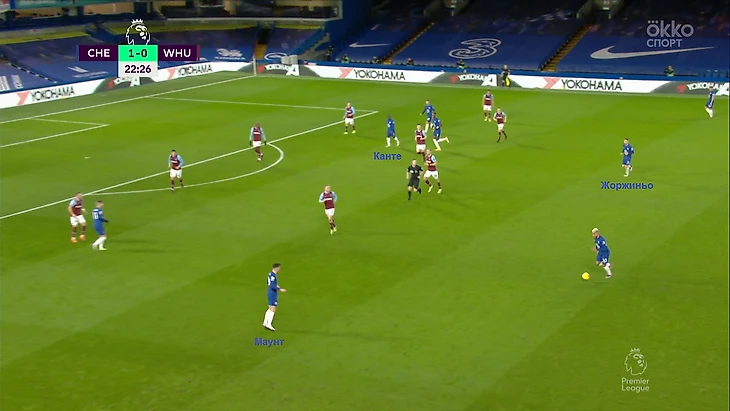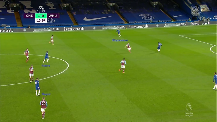В то же время движение Жоржиньо не дало бы такого эффекта без других хавбеков. Маунт и Канте заполняли зону шестерок и открывались перед Соучеком и Райсом. Это позволяло выходить из обороны через короткий розыгрыш.
