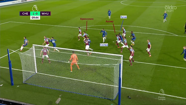 1. Гол Силвы пришел из-за ошибки Крессуэлла. В этот раз «Челси» не раскатывал глубоких комбинаций: Зума сцепил Аллера, а фуллбэк «Вест Хэма» забыл про Тиаго. Точный навес Маунта создал идеальные условия для гола.