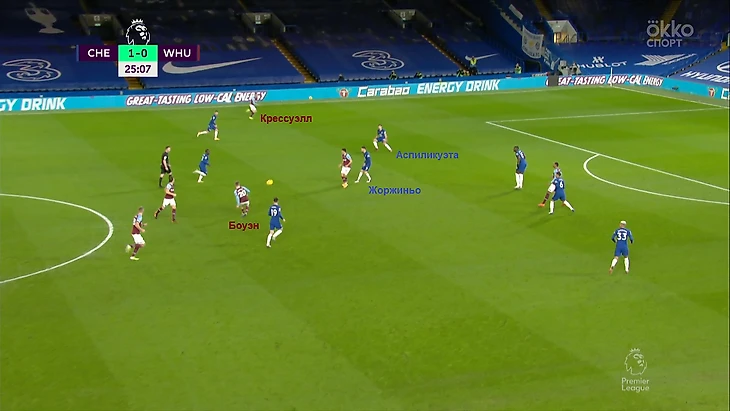 Аспиликуэта страхует Жоржиньо от прорыва Боуэна и упускает Крессуэлла, который включился по флангу – он получит передачу.