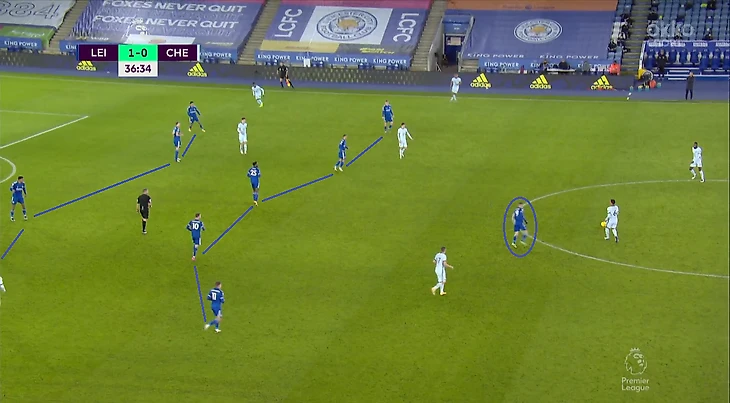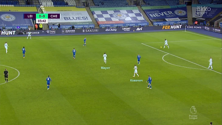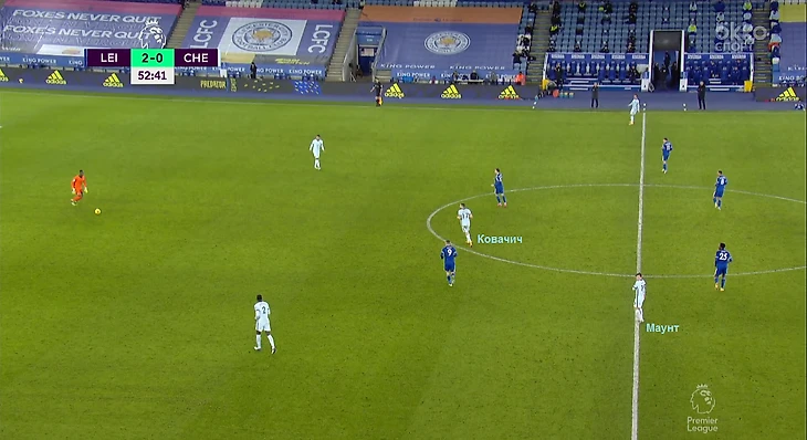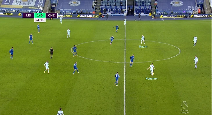 Такой же концепт был заметен в матче с «Фулхэмом» после замены Жоржиньо. Против «Лестера» этот ход не сработал из-за пассивности Маунта с Ковачичем. Оба они не могли разбить защиту соперника и часто вставали на пути прямых передач к финальной трети.