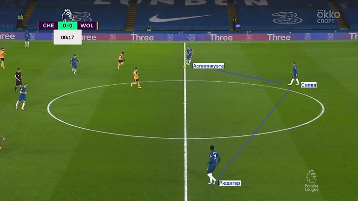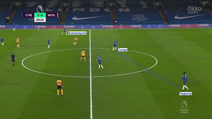 Аспиликуэта отходит во фланг и даже требует передачу. В центральном канале остаются только Силва и Рюдигер.