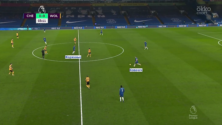 Ярче всего это бросалось в глаза в центральном канале. Схемой с двумя шестерками Тухель частично решил проблему выхода из обороны. Ковачич опускался в первую линию и помогал с продвижением, а Жоржиньо открывался выше – это должно было растянуть защитный блок «Вулверхэмптона».