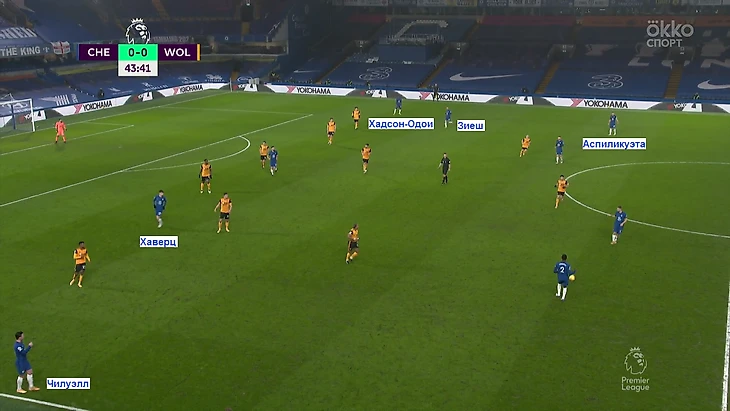 Против «Вулверхэмптона» она определила перекос нападения на правый фланг. По этому краю прошел 41% атак «Челси». Все из-за того, что действия Аспиликуэты делали схему «синих» асимметричной и перегружали правую сторону. Если слева на мяче включались Чилуэлл и Хаверц, то справа – Аспи, Хадсон-Одои и Зиеш. Логично, что команда атаковала именно перегруженным флангом.