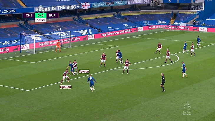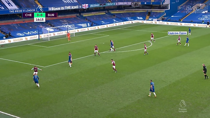 На мяче команда Тухеля развернула фронт атаки в пять человек. В первой линии «Бернли» действовали лишь четверо. Так «Челси» заполучил численное преимущество, которое освобождало одного из вингбэков от опеки. Именно это раскрыло Хадсона-Одои: он часто получал мяч в открытых зонах и создавал моменты, один из которых стал голевым.