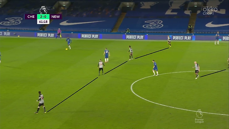 На второй тайм «Ньюкасл» вышел с обновленной схемой без мяча. Теперь команда Брюса отбивалась по 4-2-4. Ее очертания были заметны и до перерыва – например, перед первым голом «Челси».
