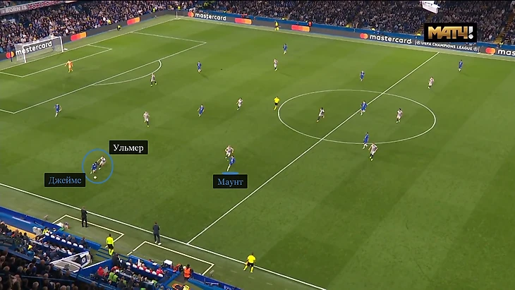 Лучший пример – выход из-под прессинга перед голом Рахима Стерлинга. К Рису Джеймсу, который принял мяч на домашней половине, бросился Андреас Ульмер. Вингбэк «Челси» развернулся и заметил, что в зону австрийца вбежал Мэйсон Маунт.