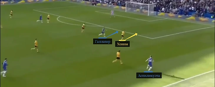 Хонни Кастро, который действовал слева, не понимал, как реагировать на Аспиликуэту. Выйдешь к флангу – в более узкую зону ускорится Конор Галлахер. Останешься ближе к центру – Сесар получит время и пространство для передачи.