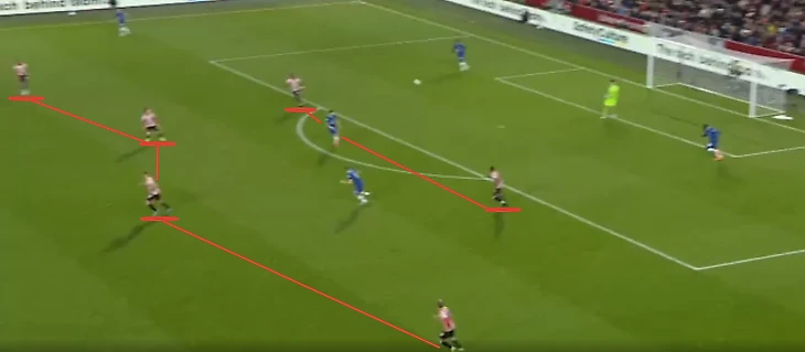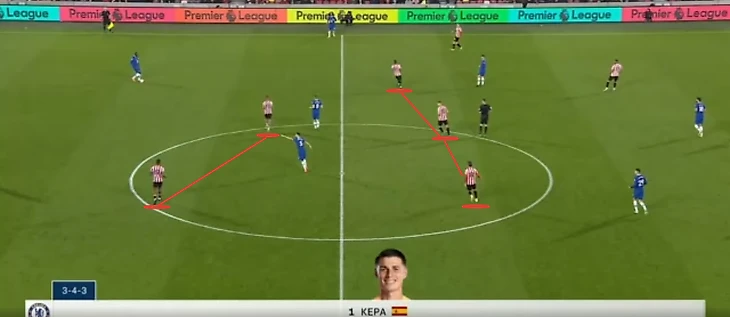 «Брентфорд» отбивался по схеме 5-3-2. Айвен Тоуни и Бриан Мбемо следили за двумя из трех центральных защитников «Челси». Оставшегося забирала ближайшая восьмерка, Фрэнк Оньека или Матиас Йенсен. В средней линии оставались два хавбека, которые опекали Жоржиньо и Конора Галлахера/Матео Ковачича.