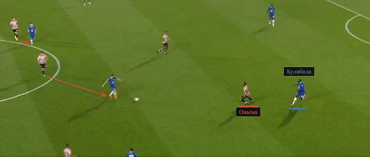 С другой, гости отрыли рабочий ход под финальную треть. Речь об игре через стеночки. Например, на 30-й минуте Кулибали закинул мяч Армандо Брое. Албанец спиной к воротам скинул Мэйсону Маунту. 19-й номер попробовал пас на ход Каю Хавертцу – не прошло.