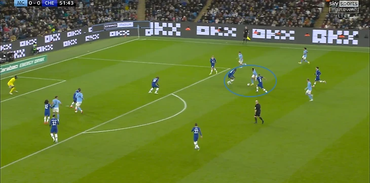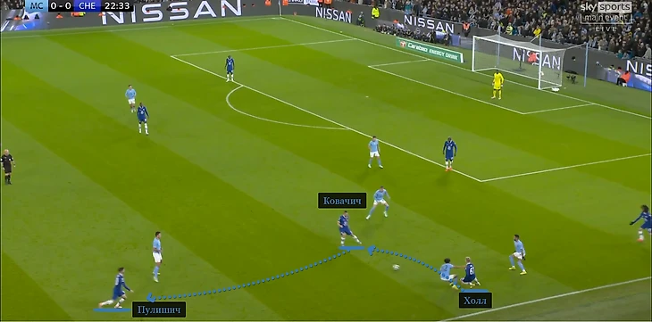 Самый наглядный пример относится к 23-й минуте. Льюис Холл принял пас спиной к воротам «Сити» и передал на Ковачича. Матео продвинул на Пулишича, который развил выпад и пробил из-под штрафной.