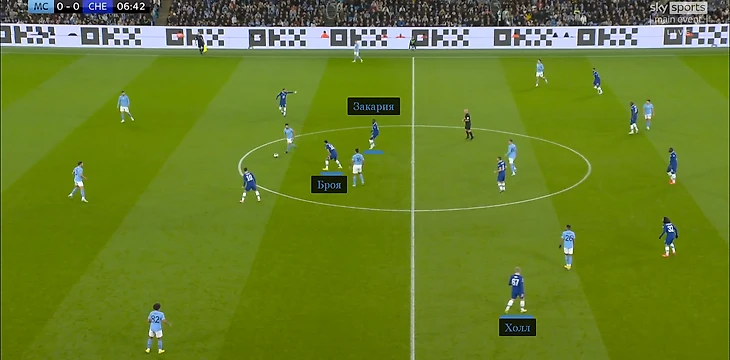 Под выезд на «Этихад» Грэм Поттер заготовил интересную систему обороны. «Челси» отбивался по схеме 5-2-3. Армандо Броя следил за опорной зоной «Сити». Хаким Зиеш и Кристиан Пулишич, которые действовали по сторонам от албанца, поддавливали центральных защитников.