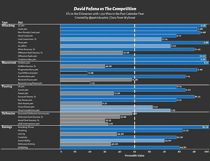 🔹 Статистика показывает, что Фофана выделяется среди других страйкеров норвежской лиги по голам, xG, касаниям в чужой штрафной, обводкам, ускорениям и протаскиваниям мяча. Датро – не просто таргетмен.