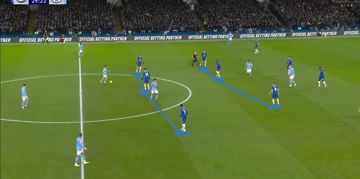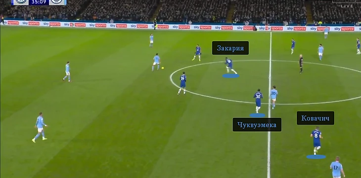 Пеп Гвардиола сразу попытался растянуть первую линию хозяев. «Челси» отбивался с двумя центральными защитниками, как и в других матчах после чемпионата мира. Даже под «Сити» Поттер не отошел к модели с тремя ЦЗ, которую использовал Томас Тухель.